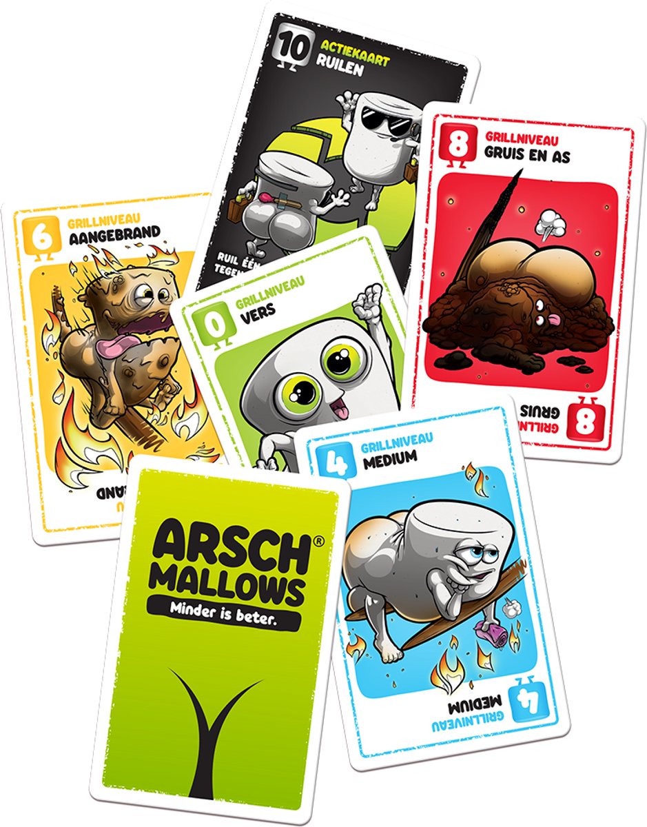 Elke speler heeft zes kaarten voor zich liggen en moet proberen de minste punten te verzamelen. Simpel toch? Helaas liggen alle kaarten op de kop! Spiek naar je kaarten, ruil ze met andere spelers, en ontdek welke gekke marshmallows voor je neus liggen. Dit vlotte spel zorgt ongetwijfeld voor veel hilariteit aan tafel en de simpele regels maken het een feest voor elke groep. Denk jij de laagste score onder je kaarten te hebben? Roep dan “Arschmallows!” en proef de zoete smaak van de overwinning!
